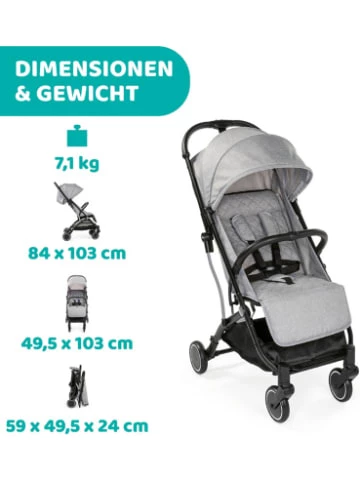 – kann wie ein Trolley gezogen werden– kompakt zusammenklappbar– mit Einhand-FaltmechanismusLässt sich wie ein Trolley hinter sich herziehen – der Buggy „Trolley Me“ von CHICCO.Aktive Babys, die selbstständig die Welt entdecken möchten, gehen gerne mal spazieren und wollen nur gelegentlich in einem Wagen sitzen – oder vielleicht doch lieber getragen werden? Da stehen Eltern schnell vor dem Problem: „Wie transportiere ich nun Buggy und Baby?“ Chicco hat die Lösung parat: den „Trolley Me“. Dieser Sportwagen ist so praktisch wie ein Koffertrolley, einfach mit einer Hand zusammenklappen und hinter sich herziehen! Der geräumige, komfortable Sitz mit Schulterpolstern und gepolstertem Mittelsteg bietet kleinen Weltentdeckern ab der Geburt bis zu einem Körpergewicht von 15 Kilogramm ein gemütliches Plätzchen. Die Rückenlehne lässt sich vollständig absenken und kann stufenlos befestigt werden. Dank verstellbarer Fußstütze kann eine Liegefläche von 85 Zentimetern Länge geschaffen werden. Das Verdeck ist mit einem Netzfenster für gute Sichtbarkeit und Luftzirkulation ausgestattet. Der besondere Clou: der innovative Frontbügel lässt sich in der Mitte öffnen, für besonders leichtes Ein- und Aussteigen.Lieferumfang:– 1 x Buggy– 1 x RegenschutzDetails:– schwenk- und feststellbare Räder– Verstellbarkeit der Rückenlehne bis in die Ruheposition– verstellbare Fußstütze– vorne gefedert– Gurtsystem: 5-Punkt– Verdeck mit Netzfenster– mit Schutzbügel– Belastbarkeit Buggy: bis zu 15 kg– Belastbarkeit Einkaufskorb: bis zu 3 kgMaße: – aufgebaut: ca. 49,5 x 103 x 84 (B x H x T)– zusammengeklappt: ca. 49,5 x 59 x 24 (B x H x L)– Länge der Liegefläche: ca. 85 cm– Gewicht: ca. 7,1 cmMaterial: Kunststoff, Textil, MetallAltersempfehlung:ab 6 Monat(e) bis 36 Monat(e)