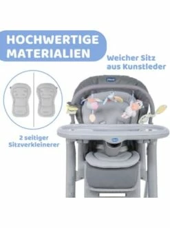 Der Hochstuhl Polly Magic Relax von CHICCO ist ein wahrer Verwandlungskünstler. Von 0 bis 6 Monaten ist er eine komfortable Babyliegesessel mit ergonomischem Sitzverkleinerer, die bereits für Neugeborene eine ideale Liegeposition bietet. Der abnehmbare Spielbogen fördert die Motorik Ihres Babys in den ersten Monaten. Von 6 bis 12 Monaten wird Polly Magic Relax zum Kinderhochstuhl, der dem Kind bei den ersten Mahlzeiten maximalen Sitzkomfort bietet. Von 12 bis 36 Monaten dient Polly Magic als Kinderstuhl, um gemeinsam mit der Familie am Tisch Mahlzeiten zu sich zu nehmen. Für maximale Sicherheit und Komfort ist der Sitz 8-fach höhenverstellbar. Der interaktive Spielbogen mit verschiedenen Spielzeugen bringt viel Spaß und fördert die motorischen Fähigkeiten des Kindes. Der Sitzverkleinerer ist waschbar und hat 2 verschiedene Seiten, die je nach Sommer oder Winter höchsten Komfort für den Nachwuchs bieten und angenehm weich sind. Der Bezug aus abwischbarem Material ist einfach zu reinigen und sehr komfortabel. Das Tablett ist abnehmbar und kann auch als Tischset verwendet werden. Ihr Kind wird mittels Gurtsystem und Mittelsteg gesichert. Geschlossen ist Polly Magic Relax sehr kompakt und bleibt alleine stehen. Die Tischplatte lässt sich hinten am Gestell befestigen. Dank der 4 praktischen Rollen kann der Hochstuhl leicht verschoben werden. Besonderheiten: – abnehmbares Essbrett – Essbrett als Tablett und Tischset verwendbar – abnehmbarer Spielbogen Details: – Maße aufgebaut (L/B/H): 53 x 83,5 x 58-106 cm – Maße zusammengeklappt (L/B/H): 53 x 31 x 101 cm – Sitzfläche (L/B): 21 x 31 cm – Maße der Rückenlehne (B/H): 43 x 50 cm – Gewicht: ca. 10,5 kg – Sitzhöhe (vom Boden): 44-64 cm – mögliche Höhen Essplatte (vom Boden gemessen): 65, 70, 73, 75, 80, 85 cm – Maße Essbrett (L/B): 31 x 59 cm – 8-fach höhenverstellbar – 3-fach verstellbare Rückenlehne Material: – 100 % Polyester Pflegehinweis: – Bezüge aus abwaschbarem Material für leichte Reinigung – Sitzverkleinerer ist waschbar Zugelassen von Geburt bis zu einem Gewicht des Kindes von 15 kg. Altersempfehlung:ab 0 Monat(e) bis 36 Monat(e)ACHTUNG: Die maximale Tragkraft beträgt 15kg.