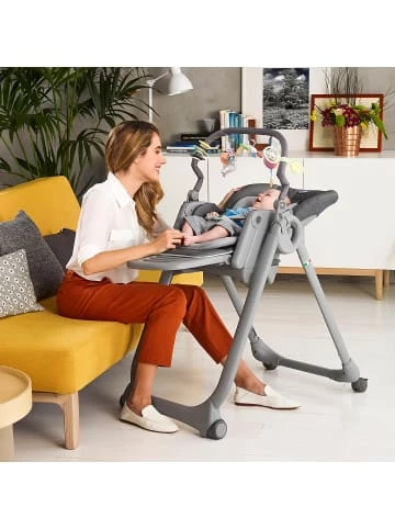 Der Hochstuhl Polly Magic Relax von CHICCO ist ein wahrer Verwandlungskünstler. Von 0 bis 6 Monaten ist er eine komfortable Babyliegesessel mit ergonomischem Sitzverkleinerer, die bereits für Neugeborene eine ideale Liegeposition bietet. Der abnehmbare Spielbogen fördert die Motorik Ihres Babys in den ersten Monaten. Von 6 bis 12 Monaten wird Polly Magic Relax zum Kinderhochstuhl, der dem Kind bei den ersten Mahlzeiten maximalen Sitzkomfort bietet. Von 12 bis 36 Monaten dient Polly Magic als Kinderstuhl, um gemeinsam mit der Familie am Tisch Mahlzeiten zu sich zu nehmen. Für maximale Sicherheit und Komfort ist der Sitz 8-fach höhenverstellbar. Der interaktive Spielbogen mit verschiedenen Spielzeugen bringt viel Spaß und fördert die motorischen Fähigkeiten des Kindes. Der Sitzverkleinerer ist waschbar und hat 2 verschiedene Seiten, die je nach Sommer oder Winter höchsten Komfort für den Nachwuchs bieten und angenehm weich sind. Der Bezug aus abwischbarem Material ist einfach zu reinigen und sehr komfortabel. Das Tablett ist abnehmbar und kann auch als Tischset verwendet werden. Ihr Kind wird mittels Gurtsystem und Mittelsteg gesichert. Geschlossen ist Polly Magic Relax sehr kompakt und bleibt alleine stehen. Die Tischplatte lässt sich hinten am Gestell befestigen. Dank der 4 praktischen Rollen kann der Hochstuhl leicht verschoben werden. Besonderheiten: – abnehmbares Essbrett – Essbrett als Tablett und Tischset verwendbar – abnehmbarer Spielbogen Details: – Maße aufgebaut (L/B/H): 53 x 83,5 x 58-106 cm – Maße zusammengeklappt (L/B/H): 53 x 31 x 101 cm – Sitzfläche (L/B): 21 x 31 cm – Maße der Rückenlehne (B/H): 43 x 50 cm – Gewicht: ca. 10,5 kg – Sitzhöhe (vom Boden): 44-64 cm – mögliche Höhen Essplatte (vom Boden gemessen): 65, 70, 73, 75, 80, 85 cm – Maße Essbrett (L/B): 31 x 59 cm – 8-fach höhenverstellbar – 3-fach verstellbare Rückenlehne Material: – 100 % Polyester Pflegehinweis: – Bezüge aus abwaschbarem Material für leichte Reinigung – Sitzverkleinerer ist waschbar Zugelassen von Geburt bis zu einem Gewicht des Kindes von 15 kg. Altersempfehlung:ab 0 Monat(e) bis 36 Monat(e)ACHTUNG: Die maximale Tragkraft beträgt 15kg.